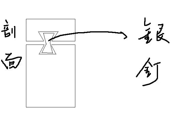 还有一种,是棺盖和两帮分别掏有八字形的孔,再做一个木头榫,谓之“银钉”,是双八字形,锯开,分别放入孔内,打入木楔,也起到钉口的作用。如图: