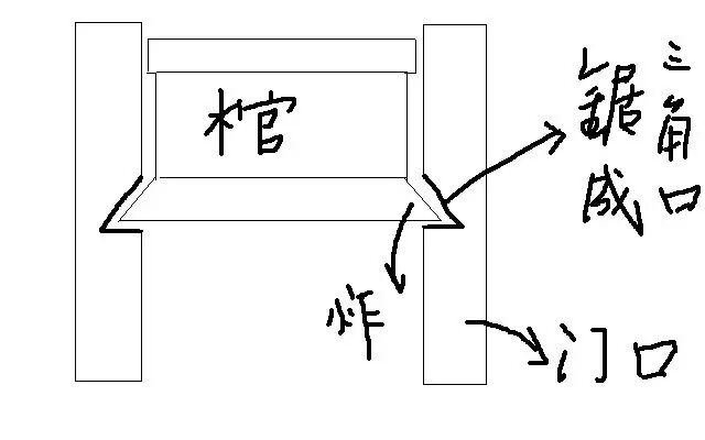 关于这个进棺材,体现到了一点我们农民的 “愚执”,因为过去正屋的门框普遍很窄(宽度为木作尺宽二尺八寸五分),不像现在,流行四扇开门,过去都是两扇门,“不敢”做大,而做成的棺材却会出现宽度大于门口的情况。这是因为,棺材底部为了表现稳固、美观,有“炸”,就是梯形突出,导致棺材往屋里进的时候,小头能进,到大头的时候,两帮能进,但是棺材底宽度大于门框宽度,卡住了,进不去里屋。亡者为大,又不能把亡人抬到外面入棺,怎么办?就用没办法的办法——锯门口。就是在门框两边,用锯把门框锯下两个三角形的豁口。如图: